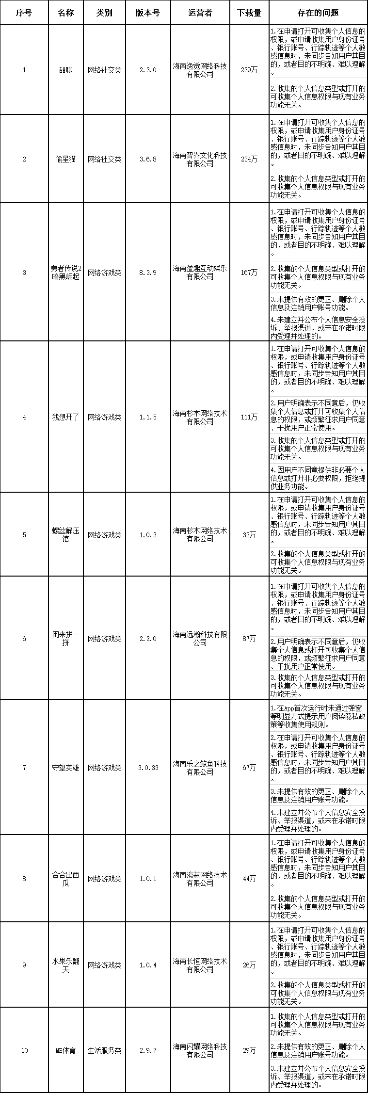 为深入推进海南省个人信息保护领域专项治理工作,近期,针对群众反映强烈的移动应用程序(包含App、小程序等)非法获取、超范围收集、过度索取权限等侵害公民个人信息的违法违规现象,海南省互联网信息办公室依据《中华人民共和国网络安全法》《中华人民共和国个人信息保护法》《App违法违规收集使用个人信息行为认定方法》《常见类型移动互联网应用程序必要个人信息范围规定》等法律和有关规定,组织对省内用户量大的移动应用程序收集使用个人信息情况进行了技术检测,检测结果显示“甜聊”“偷星猫”“勇者传说2暗黑崛起”等10款移动应用程序均存在不同程度违法违规收集使用个人信息的行为,现将有关情况通报如下: