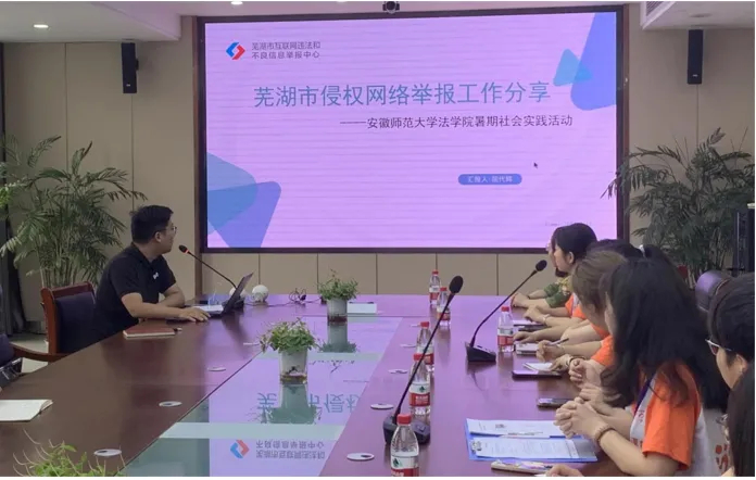 近期,安徽省芜湖市互联网违法和不良信息举报中心迎来一群特殊的客人:来自安徽师范大学法学院的9名大二本科学生。为开展2024年暑期社会实践活动,安徽师范大学法学院“数治和音”信息暴力数据治理之道调研团队受邀来到芜湖市互联网违法和不良信息举报中心开展主题实践教育活动。