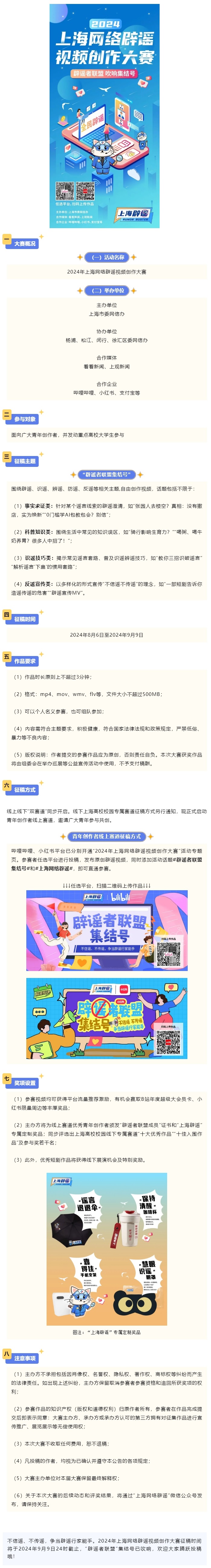 推动网络辟谣,净化网络生态,是网络文明建设的重要内容。即日起,上海市委网信办联合看看新闻、上观新闻、部分区委网信办及属地重点网站平台,面向广大青年创作者和上海高校大学生,共同发起首届“上海网络辟谣视频创作大赛”。该活动旨在通过辟谣主题视频作品征集,激发青年群体的内容创作力,提高网络辟谣参与度,推动上海网络辟谣从“权威发声”走向“全民求证”,擦亮上海特色辟谣品牌,用真相粉碎谣言,以共治破除谣言,让网络谣言无处遁形。