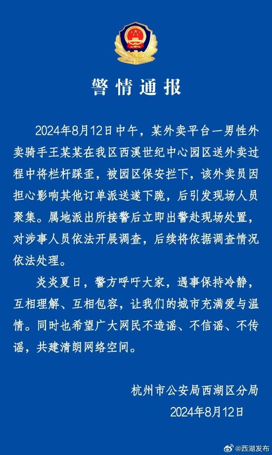 8月12日,网传“杭州保安逼迫女大学生外卖员下跪”“在现场的外卖骑手集体被封号”等信息。经与公安机关、某外卖平台多方核实,以上信息不实,系谣言!“西湖发布”“平安西湖”官方微博已于当晚发布警情通报。请广大网民加强对网上虚假信息的甄别,不信谣、不传谣,共同维护网络清朗。