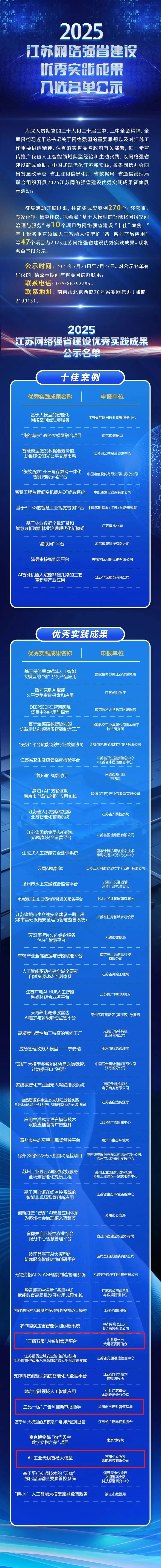 近日由省委网信办会同省发展改革委、省工业和信息化厅、省数据局、省通信管理局联合组织开展的2025江苏网络强省建设优秀实践成果入选名单正式公示