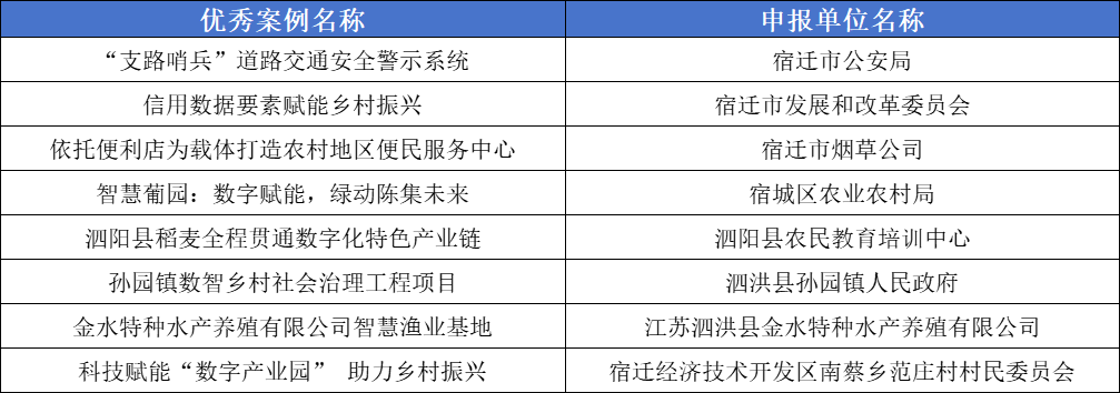 为深入贯彻落实省、市关于数字乡村发展的一系列决策部署,总结提炼实践经验,复制推广典型做法,市委网信办、市农业农村局共同开展2024年宿迁市数字乡村建设优秀案例征集活动。经各地各部门推荐、预审、专家评审,拟确定“‘支路哨兵’道路交通安全警示系统”等8个案例为2024年宿迁市数字乡村建设优秀案例,现将名单予以公示。