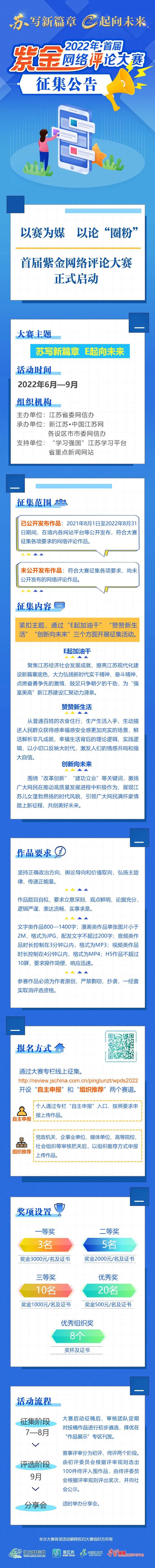 作为“苏写新篇章 E起向未来”网络主题宣传活动的一项重要内容,首届紫金网络评论大赛由江苏省委网信办主办,新江苏中国江苏网、各设区市市委网信办承办,“学习强国”江苏学习平台特别支持。大赛坚持以习近平新时代中国特色社会主义思想为指导,围绕新时代党和国家事业发展取得的历史性成就、发生的历史性变革,结合江苏改革创新实践和人民群众生产生活巨大变化,紧扣“苏写新篇章 E起向未来”主题,从“E起加油干”“赞赞新生活”“创新向未来”三个方面开展征集活动。