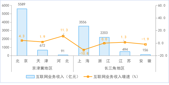 京津冀地区互联网业务收入稳步增长。京津冀地区完成互联网业务收入6352亿元,同比增长4.1%,占全国互联网业务收入的35.2%。长三角地区完成互联网业务收入6409亿元,同比下降6.3%,占全国互联网业务收入的35.5%。