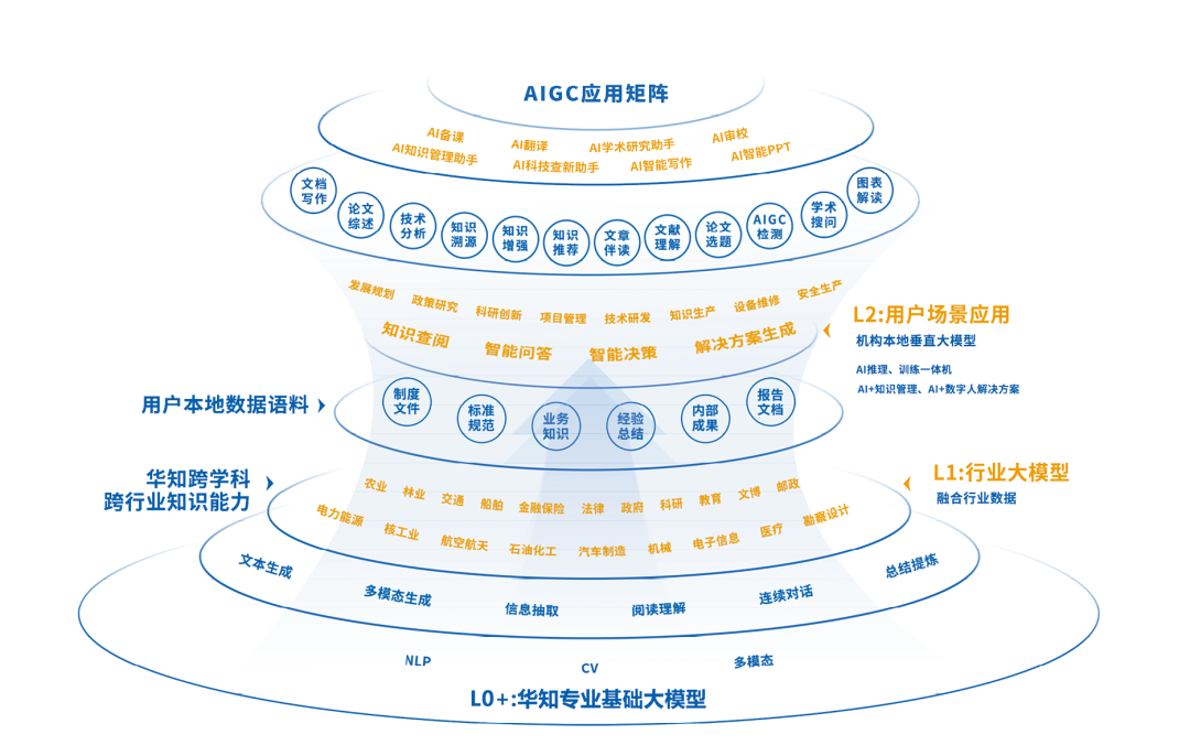 图为华知大模型从L0+到L1、L2的三层架构体系,L0+层包括NLP(自然语言处理)、CV(计算机视觉)及多模态三个基础模型,通过行业和用户高质量数据可信增强大模型生成能力,使其具备业务理解和实际问题解决能力,为业务赋能。