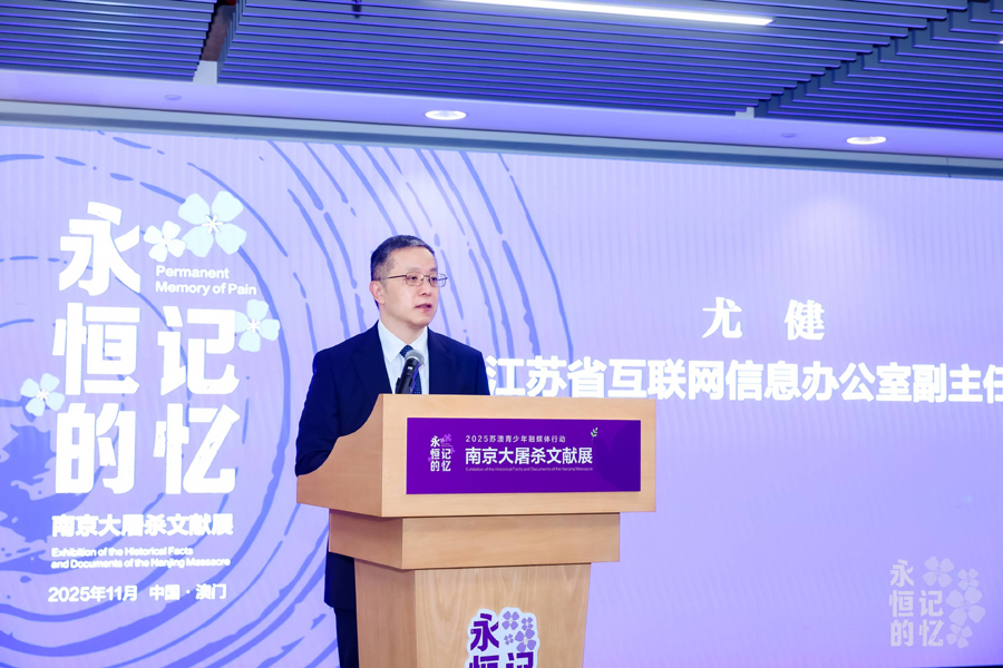 江苏省互联网信息办公室副主任尤健在致辞中表示,此次“永恒的记忆”南京大屠杀文献展落地澳门,旨在全方位、立体化地呈现历史真相,教育引导澳门青少年群体厚植家国情怀,在新时代唱响爱国爱澳主旋律。尤健指出,“希望苏澳两地以展览为平台,让历史记忆启明未来;以传播为纽带,让抗战精神薪火相传;以文化为桥梁,让爱国主义熠熠生辉。”自2022年以来,“少年志·中国心·向未来”苏澳青少年融媒体行动已经第四次走进澳门,尤健表示,此次展览的落地将进一步激发澳门同胞赓续爱国、团结、奋斗传统,始终与祖国同频共振,在建设强大祖国和美好澳门的广阔天地中绽放光彩。