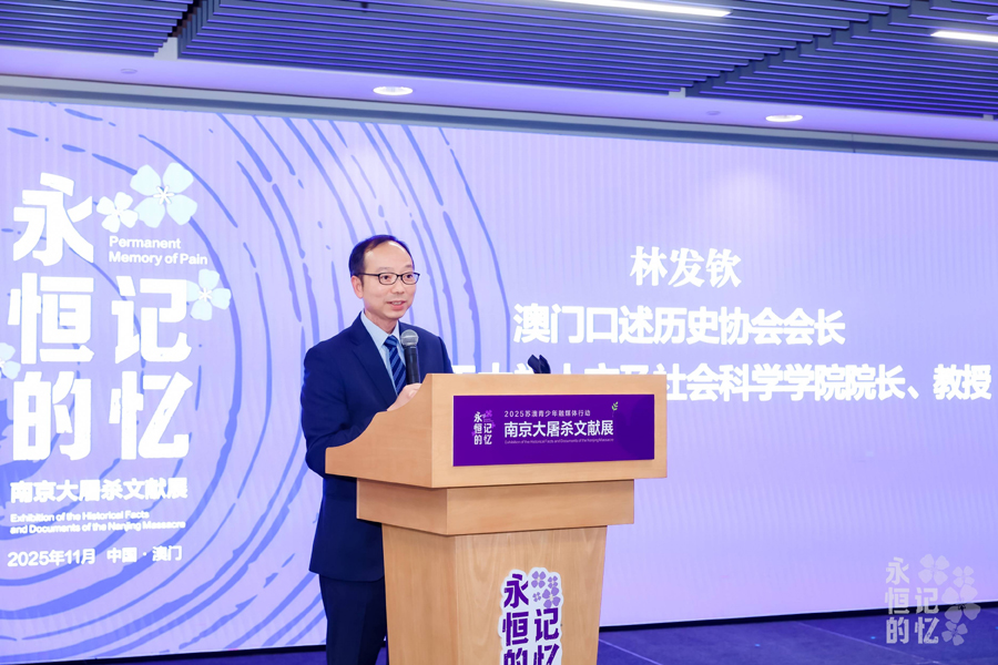11月18日,“永恒的记忆”南京大屠杀文献展在澳门开展。本次展览是“少年志·中国心·向未来”2025苏澳青少年融媒体行动的重要内容,由江苏省互联网信息办公室、新华报业传媒集团指导,澳门口述历史协会、侵华日军南京大屠杀遇难同胞纪念馆、扬子晚报网·少年志共同主办,澳门特别行政区政府文化发展基金、中央政府驻澳门联络办公室宣传文化部、澳门特别行政区政府文化局提供特别支持。该展览将在中国与葡语国家商贸合作服务平台综合体B1多功能区1-6室持续展出一个月,以珍贵史料筑牢历史记忆,凝聚和平力量。