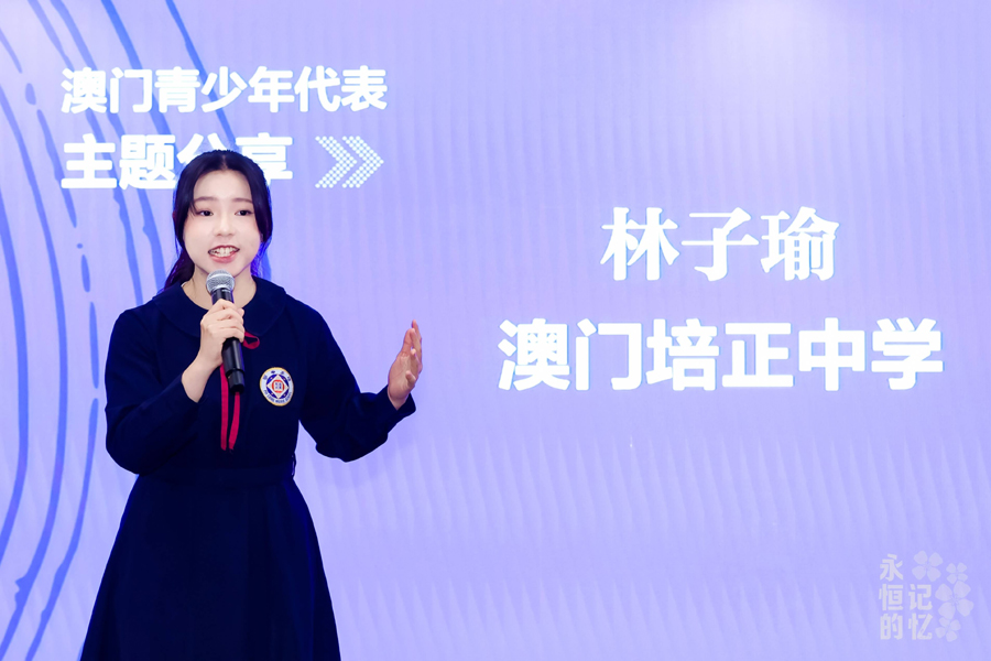青少年代表、澳门培正中学林子瑜在主题演讲中说,自己在观看影片《南京照相馆》以及九三阅兵后,加深了对“爱国奋斗”的理解。