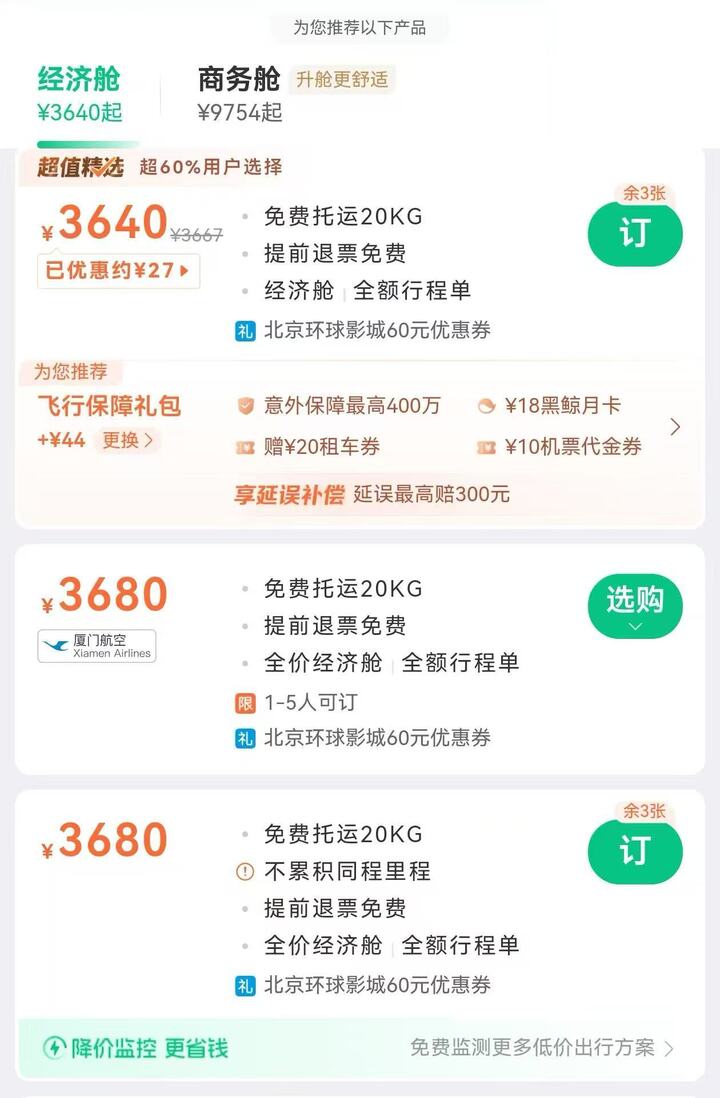 例如记者在另一购票平台查询了一趟从三亚到北京的机票,排名第一的选项价格为3640元,“订票”按钮的设置与价格平行,在一条分隔线下方写着“为您推荐飞行保障礼包”,看起来这是一个需要额外点击才会购买的独立选项,但实际上这也是一个捆绑销售的套餐产品。
