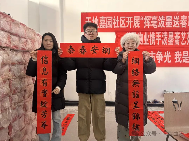 曲阳县委网信办走进天地嘉园社区开展网络辟谣宣传活动。泼墨斋艺苑工作人员根据群众要求,现场书写饱含祝福的对联和福字。“网络无谣呈锦绣 信息有宝绽芳华”“力破谣言千重雾 广传真相一路春”等寓意吉祥的春联饱含着对美好生活的祝福,也将网络辟谣内容融入笔墨之中。此外,网络志愿者们还通过发放宣传单页、面对面讲解的方式,提醒大家不信谣、不造谣、不传谣。