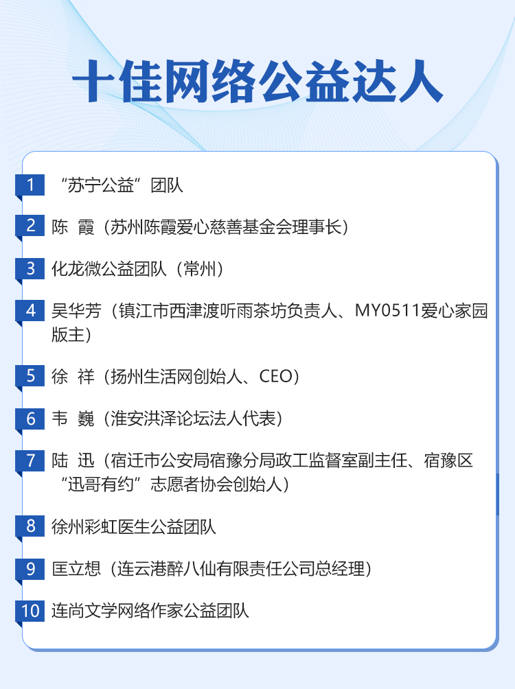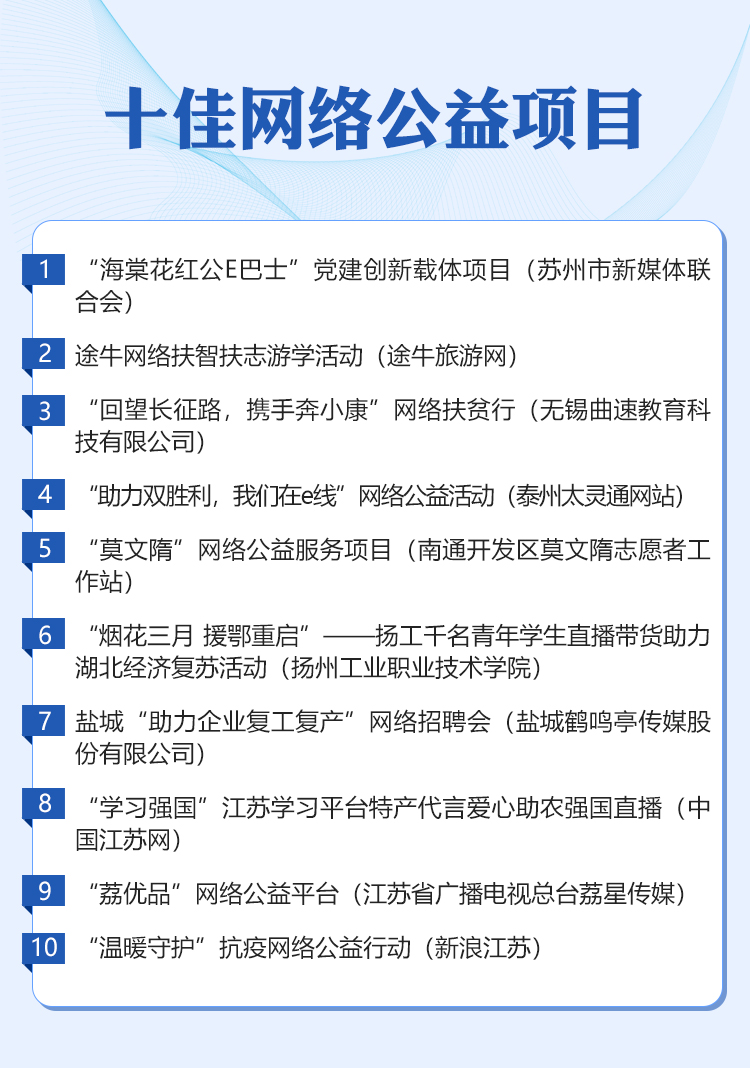 经研究,现对第三届江苏十佳网络公益项目、十佳网络公益达人推选结果进行公示。