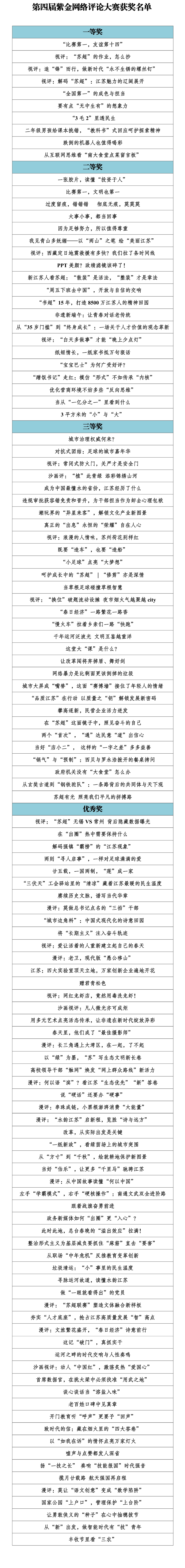 第四届紫金网络评论大赛由中共江苏省委网信办、江苏省新闻工作者协会联合举办,经前期申报、推荐和专家遴选,现将拟确定的一、二、三等奖及优秀奖进行公示。公示时间为2025年12月31日至2026年1月7日。如对公示名单有异议,请在公示期内向省委网信办网络传播处反映。联系电话:025—86292753,18120145350。
