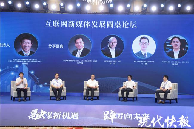 现场,中国社会科学院新媒体研究中心秘书长、中国社会科学院新闻与传播研究所数字媒体研究室主任黄楚新主持互联网新媒体发展圆桌论坛。围绕 " 深度融合背景下的传媒发展路径 " 这一主题,人民网舆情数据中心副主任,人民在线副总经理、总编辑单学刚,现代快报社党委书记、社长赵磊,浙江大学传媒与国际文化学院院长韦路,无锡广电集团 ( 台 ) 党委书记、总裁、台长陈秋峰分别带来分享。
