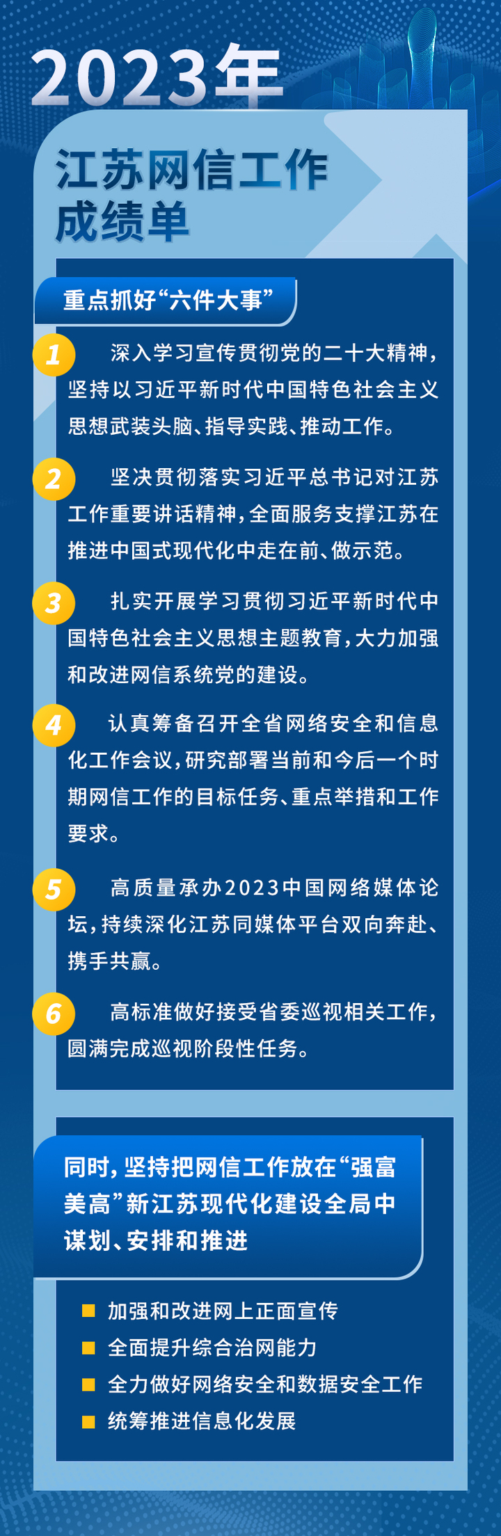 会议首先亮出2023年江苏网信工作成绩单。这一年,在省委坚强领导下,全省网信系统坚持把深入学习宣传贯彻党的二十大精神、习近平总书记对江苏工作重要讲话重要指示精神和开展学习贯彻习近平新时代中国特色社会主义思想主题教育,作为贯穿全年工作的主题主线,一体谋划、一体部署、一体推进。认真贯彻落实全国全省宣传思想文化工作会议、网信工作会议精神,在加强网络内容建设与管理、筑牢网络安全屏障、发挥信息化驱动引领作用、强化党的建设和干部队伍建设中展现了新作为、取得了新成效。