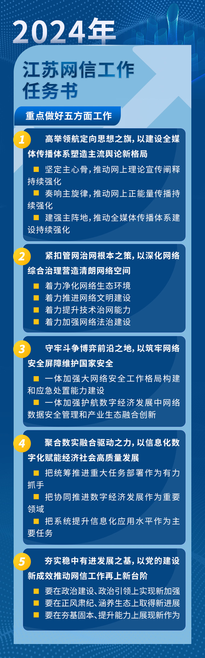 会议强调,2024年是中华人民共和国成立75周年,是实现“十四五”规划目标任务的关键一年,是习近平总书记提出网络强国战略目标10周年和我国全功能接入国际互联网30周年。全省网信系统必须坚持以习近平新时代中国特色社会主义思想特别是习近平文化思想、习近平总书记关于网络强国的重要思想为指导,全面贯彻落实党的二十大精神和习近平总书记对江苏工作重要讲话重要指示精神,贯彻落实习近平总书记关于网信工作的重要指示和全国网信工作会议精神,深刻领悟“两个确立”的决定性意义,坚持稳中求进工作总基调,完整准确全面贯彻新发展理念,牢牢把握“四个走在前”“四个新”重大任务,举旗铸魂强根基、服务大局强统筹、聚焦使命强担当、从严求实强队伍,发展壮大网上主流价值、主流舆论、主流文化,全力推动网信事业高质量发展,更好服务和支撑江苏在推进中国式现代化中走在前、做示范。