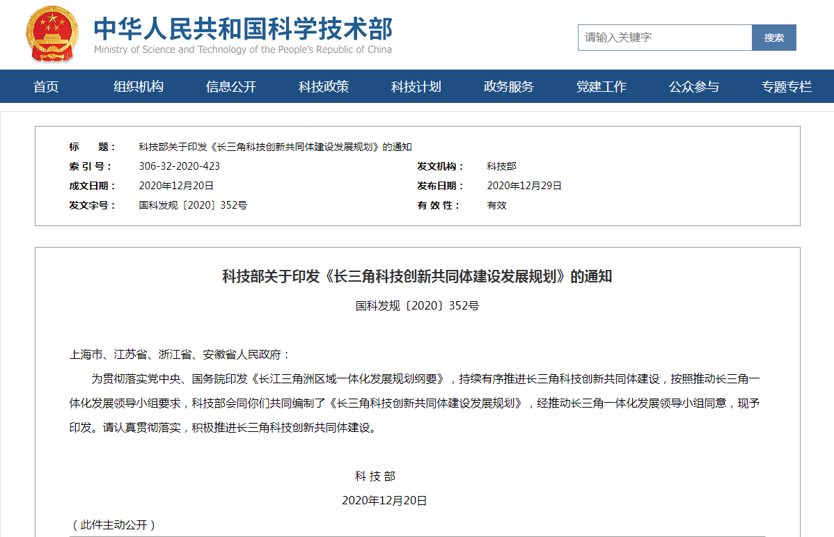 交汇点讯 为贯彻落实党中央、国务院印发《长江三角洲区域一体化发展规划纲要》,持续有序推进长三角科技创新共同体建设,按照推动长三角一体化发展领导小组要求,科技部会同上海市、江苏省、浙江省、安徽省人民政府共同编制了《长三角科技创新共同体建设发展规划》(以下简称《规划》),并于近日印发。