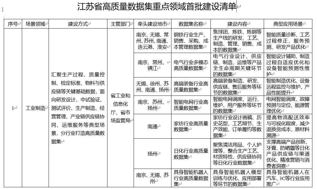 据悉,首批建设清单的发布,有望加速推动江苏相关重点领域高质量数据集的开放、共享、流通,赋能交通、医疗、教育等行业大模型,工业、农业、政务等领域大模型训练和应用,赋能江苏经济社会高质量发展。