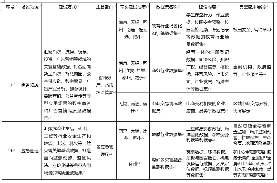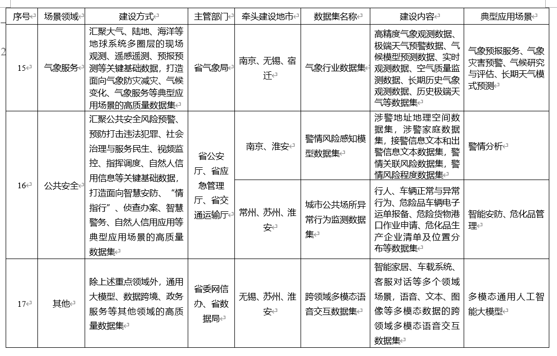 首批建设清单,锚定江苏数据富集领域及创新领域发力。清单共涉及工业制造、交通运输、医疗健康、科学研究、金融服务、文化旅游、城市治理、人力资源、绿色低碳、农业农村、智慧能源、教育教学、商务领域、应急管理、气象服务、公共安全16个重点领域,以及除上述重点领域外,通用大模型、数据跨境、政务服务等其他领域的高质量数据集。