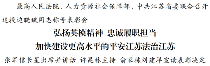 7月10日,最高人民法院、人力资源社会保障部、中共江苏省委在南京联合召开追授边晓斌同志称号表彰会,追授边晓斌同志“全国模范法官”、“江苏省优秀共产党员”称号。最高人民法院党组书记、院长张军,省委书记、省人大常委会主任信长星出席会议并讲话。省委副书记、省长许昆林主持会议。人力资源社会保障部党组成员、副部长俞家栋宣读追授边晓斌同志“全国模范法官”称号的决定,省委常委、省委组织部部长刘建洋宣读追授边晓斌同志“江苏省优秀共产党员”称号的决定。