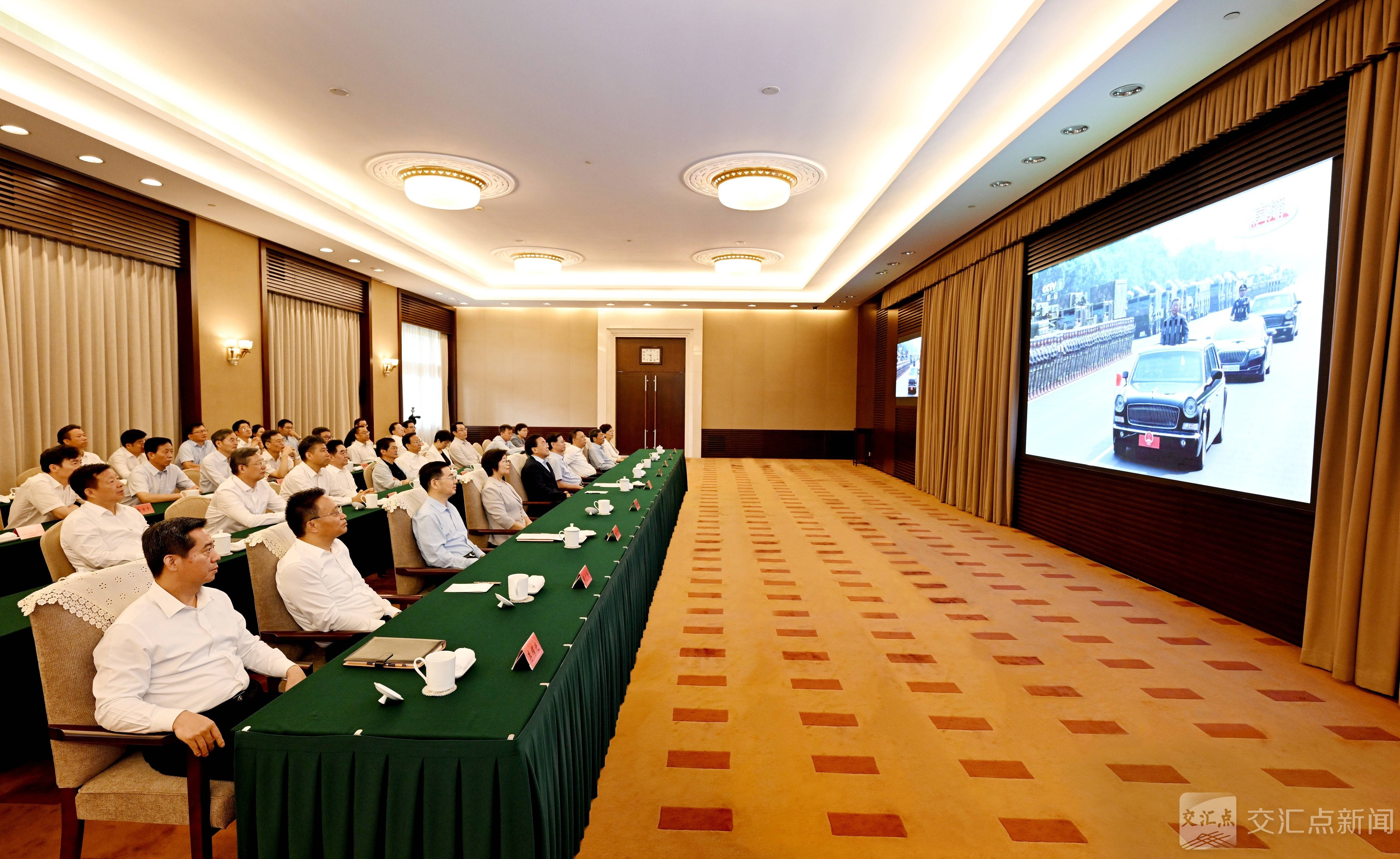 习近平总书记发表重要讲话时,省领导仔细聆听、认真记录。随后,大家观看了盛大的阅兵仪式。意气风发的受阅部队浩荡前行,装备精良的国之重器彰显中国力量。当战旗方队接受检阅时,直播画面中出现“刘老庄连”“兴化部队”等荣誉旗帜,大家倍感亲切、格外自豪。
