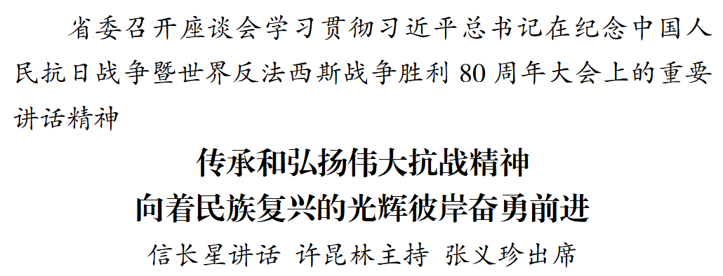 9月4日,省委召开座谈会,学习贯彻习近平总书记在纪念中国人民抗日战争暨世界反法西斯战争胜利80周年大会上的重要讲话精神,铭记历史、缅怀先烈、珍爱和平、开创未来,以伟大抗战精神激励全省上下为推进中国式现代化江苏新实践不懈奋斗,向着中华民族伟大复兴的光辉彼岸奋勇前进。省委书记信长星出席座谈会并讲话,省长许昆林主持座谈会,省政协主席张义珍出席座谈会。