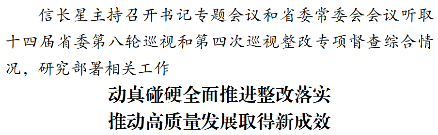 11月25日、26日,省委书记信长星先后主持召开书记专题会议和省委常委会会议,听取十四届省委第八轮巡视和第四次巡视整改专项督查综合情况,研究部署相关工作。