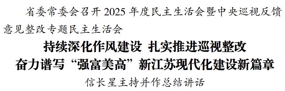 按照党中央部署要求,1月29日,省委常委会用一整天时间召开2025年度民主生活会暨中央巡视反馈意见整改专题民主生活会,以中央政治局民主生活会为标杆,深入学习贯彻习近平新时代中国特色社会主义思想,全面贯彻落实党的二十届四中全会精神和习近平总书记对江苏工作重要讲话精神,围绕锲而不舍落实中央八项规定精神、从严从实抓好中央巡视反馈意见整改,进行检视剖析、党性分析,以优良作风凝心聚力、真抓实干,奋力谱写“强富美高”新江苏现代化建设新篇章。