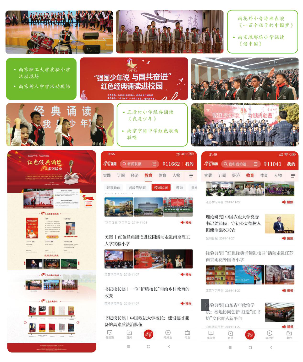 (四)传承红色基因,弘扬爱国精神。为配合江苏省委宣传部、江苏省全民阅读活动领导小组主办的“阅读红色经典 传承红色基因”全民阅读推广活动,江苏省全民阅读办、新华报业传媒集团策划推出“强国少年说 与国共奋进”红色经典诵读系列活动。活动选取“庆祝新中国成立70周年红色经典阅读活动荐读书单”中的70本红色经典图书,以“线上”+“线下”丰富的内容形式宣传习近平新时代中国特色社会主义思想,讲述红色经典故事、弘扬红色革命精神、赓续红色基因。此活动将陆续走进全省各地中小学,引导广大青少年坚定“为中华之崛起而读书”的信念,树立正确的人生观、世界观、价值观以及学习观,扣好人生第一粒扣子。