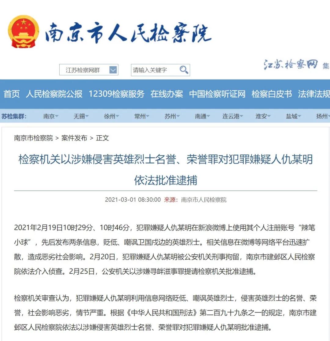 2021年2月19日10时29分、10时46分,犯罪嫌疑人仇某明在新浪微博上使用其个人注册账号“辣笔小球”,先后发布两条信息,贬低、嘲讽卫国戍边的英雄烈士。相关信息在微博等网络平台迅速扩散,造成恶劣社会影响。2月20日,犯罪嫌疑人仇某明被公安机关刑事拘留,南京市建邺区人民检察院依法介入侦查。2月25日,公安机关以涉嫌寻衅滋事罪提请检察机关批准逮捕。