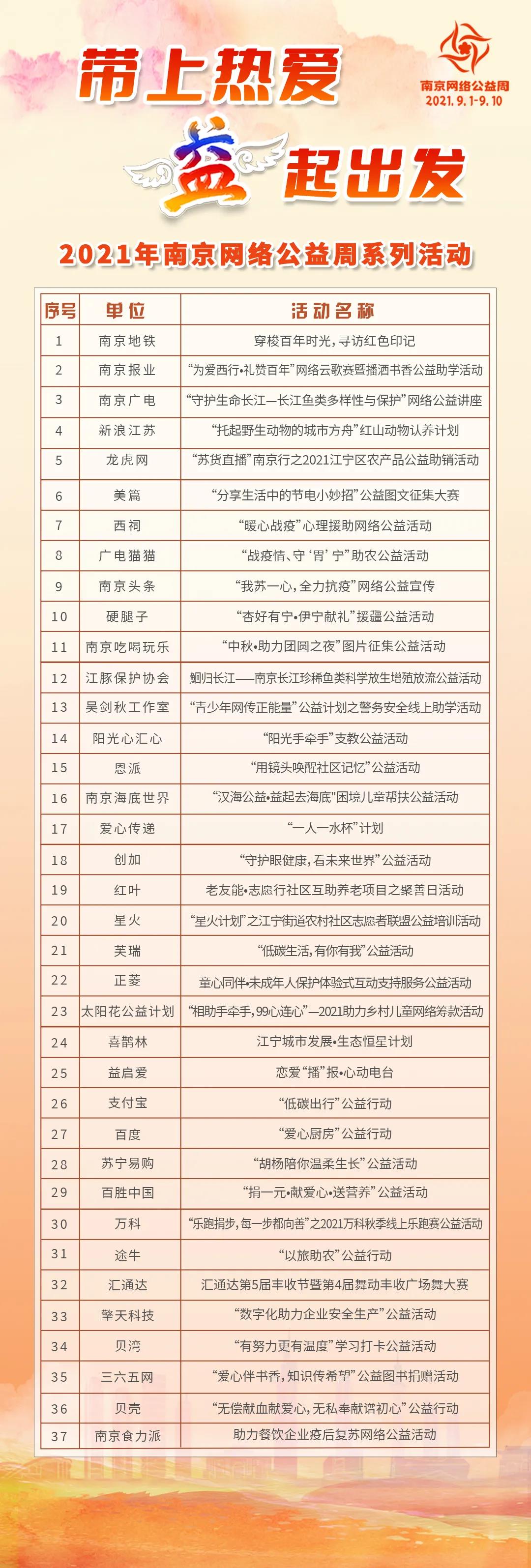 用热爱温暖一座城市、点亮一方网络空间。9月1日至10日,以“带上热爱,益起出发”为主题的2021南京网络公益周活动正式启动。活动由江苏省委网信办指导、南京市委网信办主办,旨在放大网络公益正能量,打造南京网络公益特色品牌,将南京建设成“网络公益示范城市”。