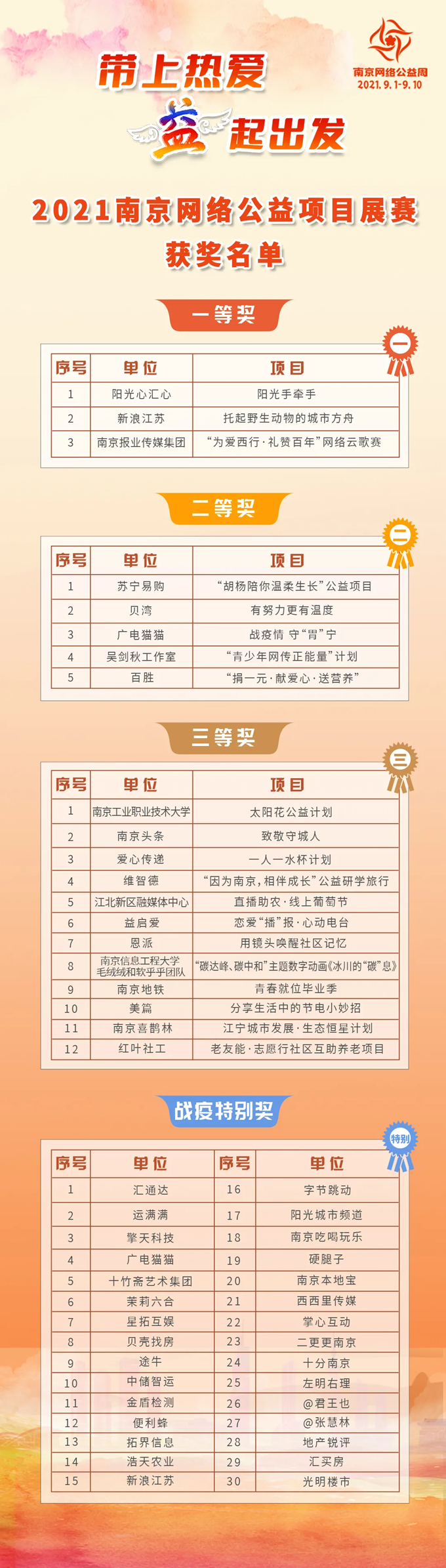 公益周期间,“南京网络公益项目展赛”同步开展,专业评委对项目的创新特色、成果成效、社会影响等进行综合评价,最终评选出一等奖3名,二等奖5名、三等奖12名、战疫特别奖30名。