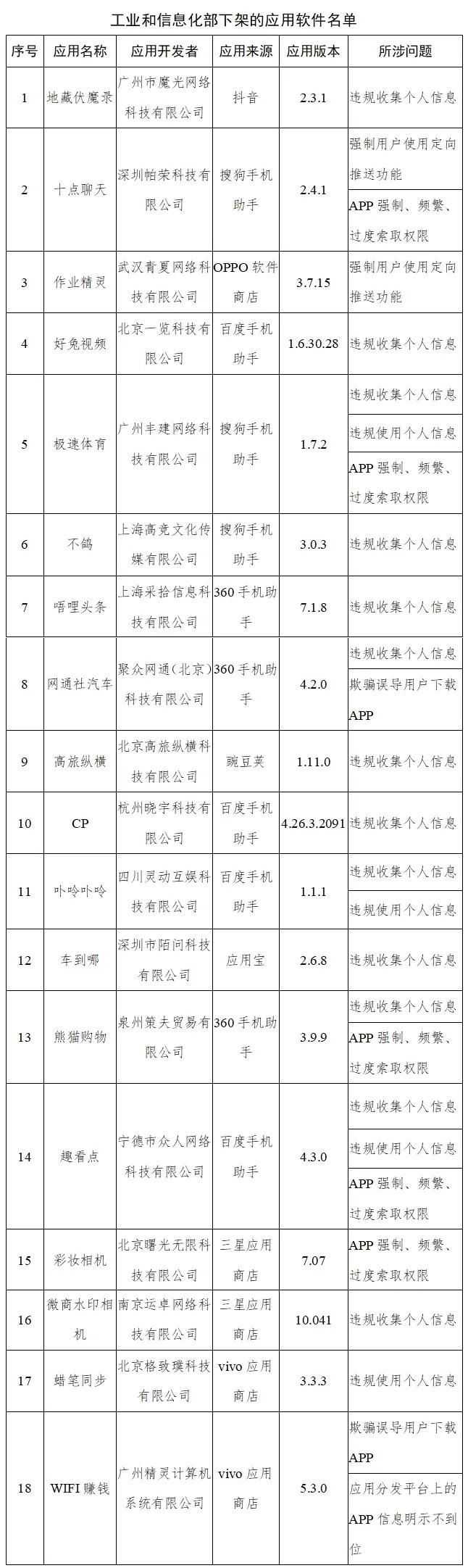 工信部12日通报下架“地藏伏魔录”“十点聊天”“作业精灵”等48款侵害用户权益App。在下架的48款App中,18款未按照工信部要求完成整改,上海、安徽、广东、四川省(市)通信管理局检查发现30款App未完成整改。