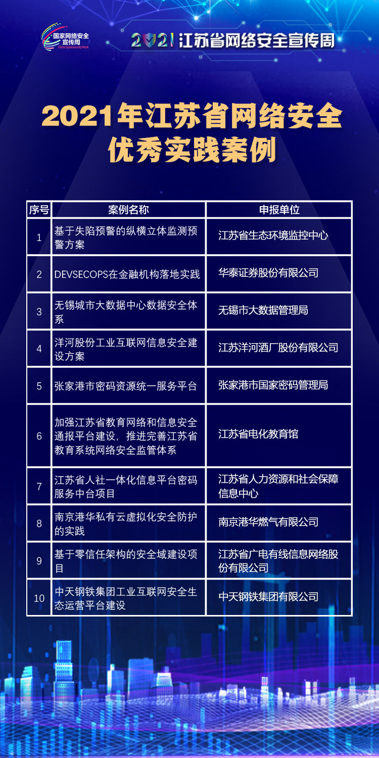 10月11日,2021年江苏省网络安全宣传周在宿迁启动。开幕式上,公布了2021年江苏省网络安全优秀实践案例。