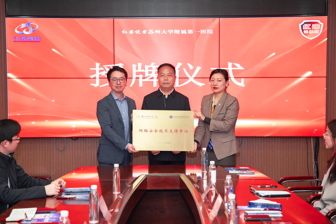 (从左到右:苏州大学附属第一医院信息处处长刘亚军、苏州市委网信办副主任李天德、江苏天创科技有限公司常务副总经理赵历)