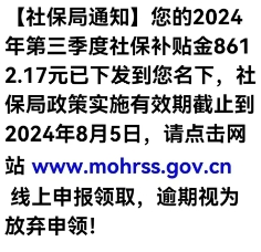市人社局介绍,近期,有不法分子冒用社保部门名义发送短信,称社保补贴金已发,要求职工群众点击链接提供个人信息。信息看似正规,实则是骗局!信息内网站为涉诈钓鱼网址。请大家注意甄别!详见↓