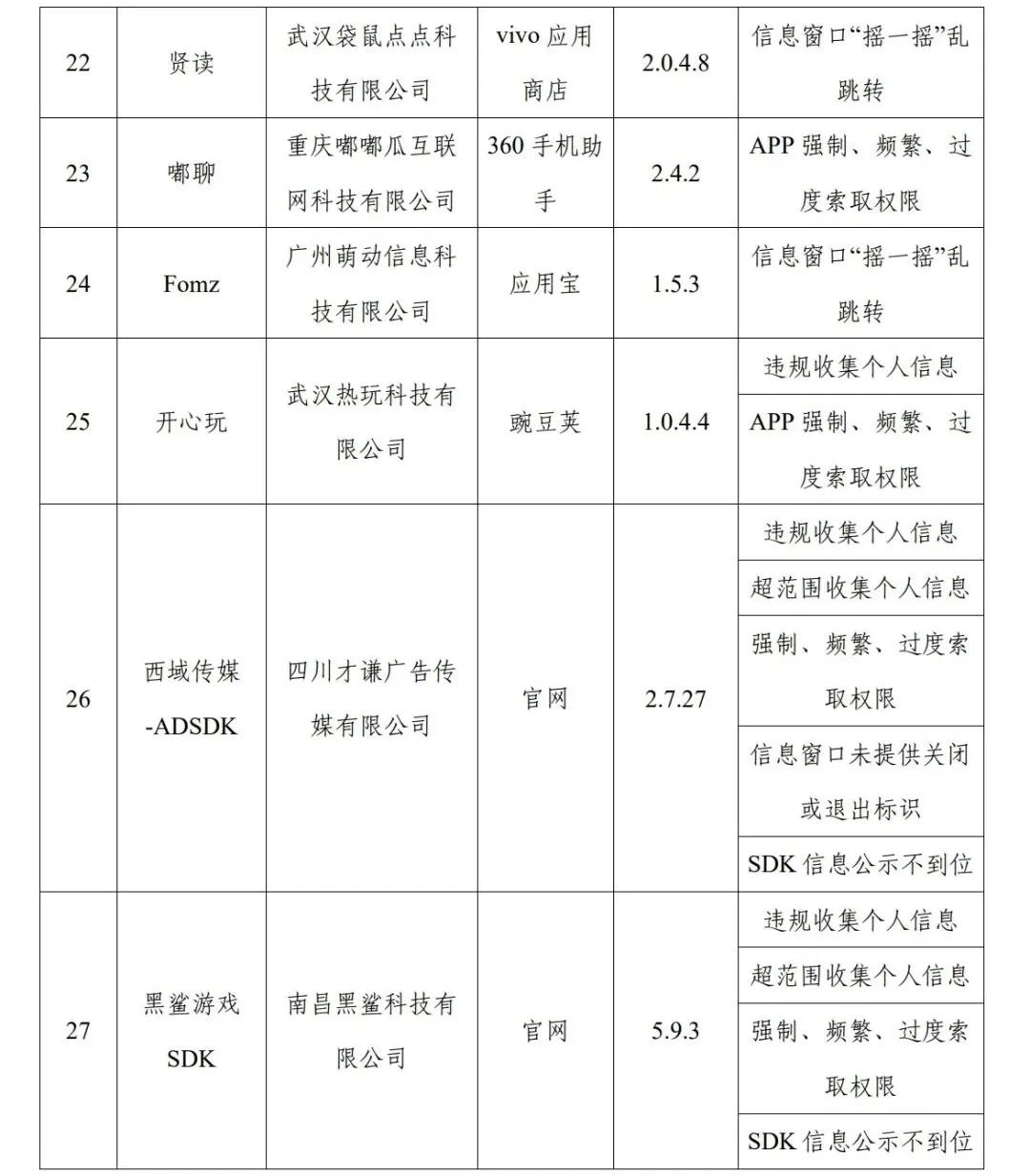 工业和信息化部高度重视用户权益保护工作,依据《个人信息保护法》《网络安全法》《电信条例》《电信和互联网用户个人信息保护规定》等法律法规,持续整治APP侵害用户权益的违规行为。近期,工信部组织第三方检测机构进行抽查,共发现27款APP及SDK存在侵害用户权益行为(详见附件),现予以通报。上述APP及SDK应按有关规定进行整改,整改落实不到位的,我部将依法依规组织开展相关处置工作。