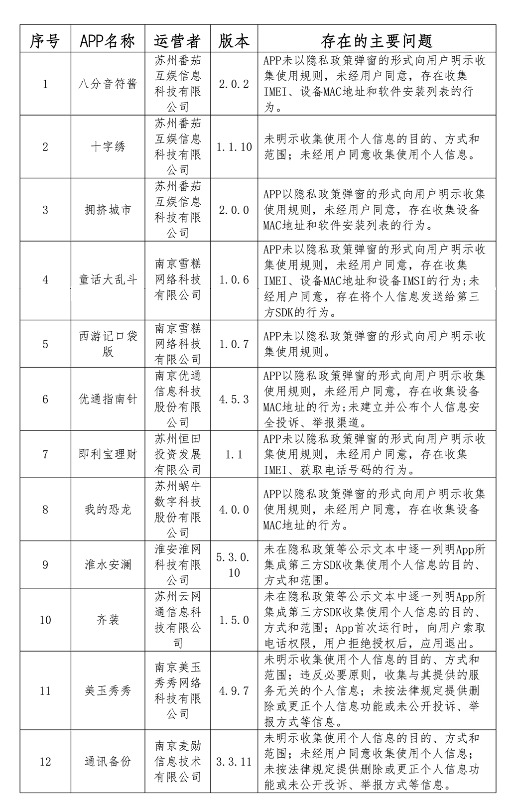近期,针对人民群众反映强烈的App非法获取、超范围收集、过度索权等侵害个人信息的问题,江苏省委网信办、省公安厅、省市场监督管理局、省通信管理局依据《中华人民共和国网络安全法》《App违法违规收集使用个人信息行为认定方法》《常见类型移动互联网应用程序必要个人信息范围规定》等法律和有关规定,对省内重点App的个人信息收集使用情况进行了检测。现将前期通报未按要求整改的App予以下架,通报一批存在问题App。