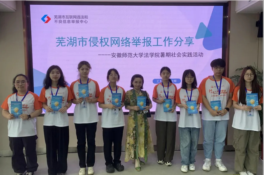近期,安徽省芜湖市互联网违法和不良信息举报中心迎来一群特殊的客人:来自安徽师范大学法学院的9名大二本科学生。为开展2024年暑期社会实践活动,安徽师范大学法学院“数治和音”信息暴力数据治理之道调研团队受邀来到芜湖市互联网违法和不良信息举报中心开展主题实践教育活动。