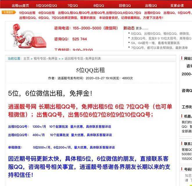 别不相信。记者查询网络发现,租借QQ号及相关的微信号、游戏账号已经成为一门生意,网络上不仅有专门的租号平台,还形成了市场价——5位号码每月1300元起,6位号码每月400元起,10个就算批发,量大从优。