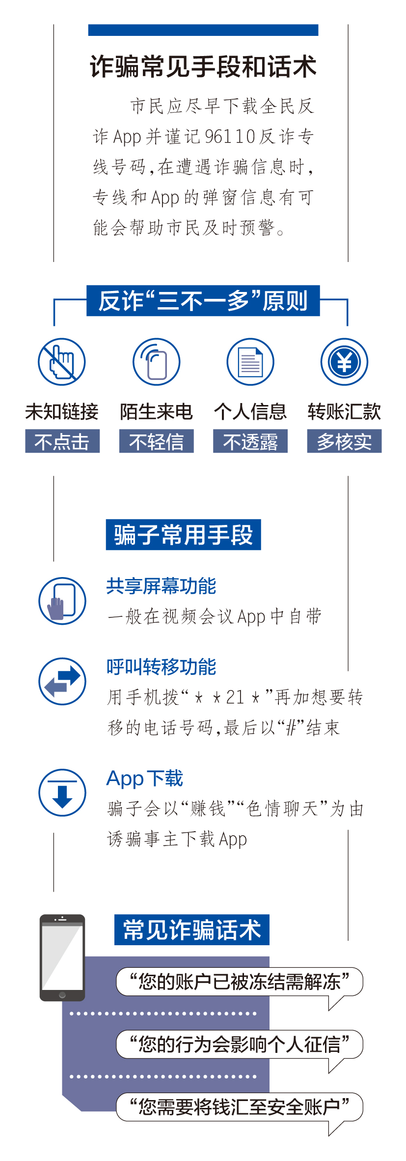 王佳表示,现在国家在大力推广全民反诈App以及96110反诈专线,市民应尽早下载App并谨记专线号码,在遭遇诈骗信息时,专线和App的弹窗信息有可能会帮助市民及时预警。此外,反诈中还有一个三不一多原则需要牢记:“未知链接不点击 陌生来电不轻信 个人信息不透露 转账汇款多核实”。