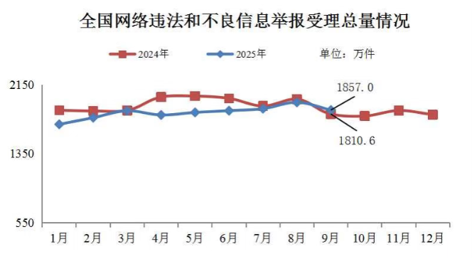 2025年9月,中央网信办举报中心指导全国各级网信举报工作部门、主要网站平台受理网民举报色情、赌博、侵权、谣言等违法和不良信息1857万件,环比下降4.6%、同比增长2.6%。其中,中央网信办举报中心受理举报39.4万件,环比下降7.4%、同比下降1.6%;各地网信举报工作部门受理举报100.8万件,环比增长58.8%、同比下降9%;全国主要网站平台受理举报1716.8万件,环比下降6.7%,同比增长3.4%。