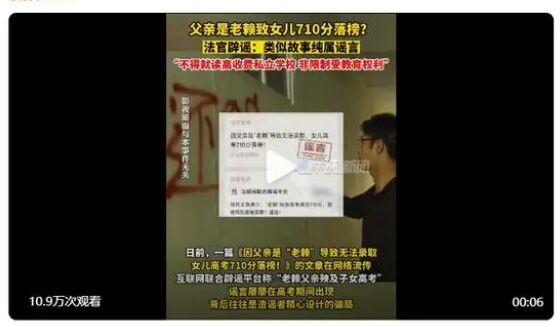 昨天,一则《父亲是“老赖”导致女儿710分落榜?法官:纯属谣言故事版本迥异情节惊人雷同》的新闻冲上头条热榜。新闻称,日前,一篇《因父亲是“老赖”导致无法录取,女儿高考710分落榜!》的文章在微信流传,该文称,一个女生高考考了710分,却因父亲贷款失信而被学校拒绝。招生办认为她的父亲不讲信用,女儿也很可能受到影响,高校不能录取品行不端的人。