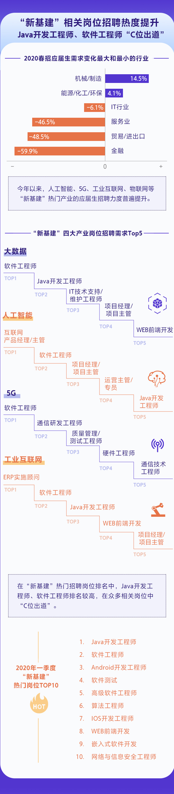 受疫情影响,今年以来,新基建相关热门产业的应届生招聘力度普遍提升。据BOSS直聘研究院最新发布的报告显示,在2020年春招季,5G、人工智能、物联网、云计算、集成电路、大数据等领域的应届生岗位比例普遍增长了1-5个百分点,为专业对口和有兴趣进入“新基建”领域的应届生提供了良好机会。