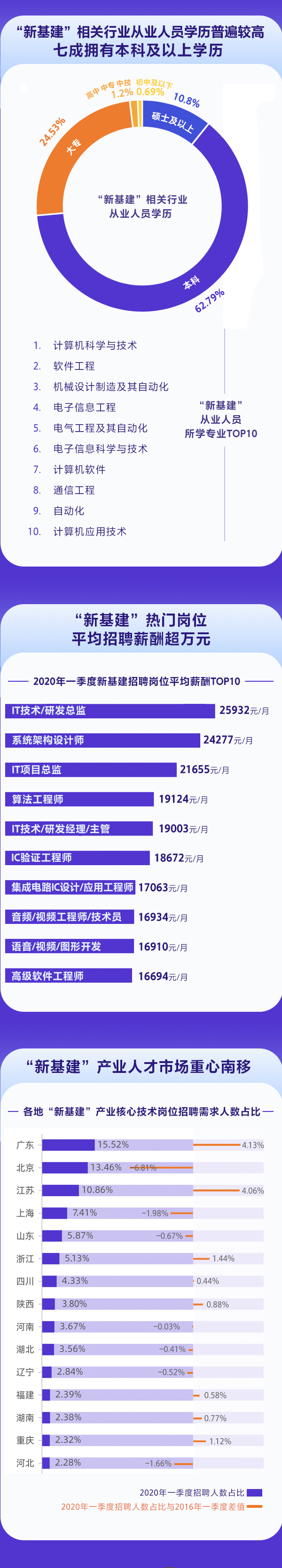 此外,近年来新基建产业人才市场重心出现南移。在广东省2020年度重点基础设施项目投资计划中,新型基础设施项目数为165项,占比34.1%,在全国所有省份中领先。江苏、上海等地也先后推出了加快推进数字“新基建”扩大信息消费和支持发展5G网络的政策意见、《上海市推进新型基础设施建设行动方案(2020-2022年)》,积极布局新基建。
