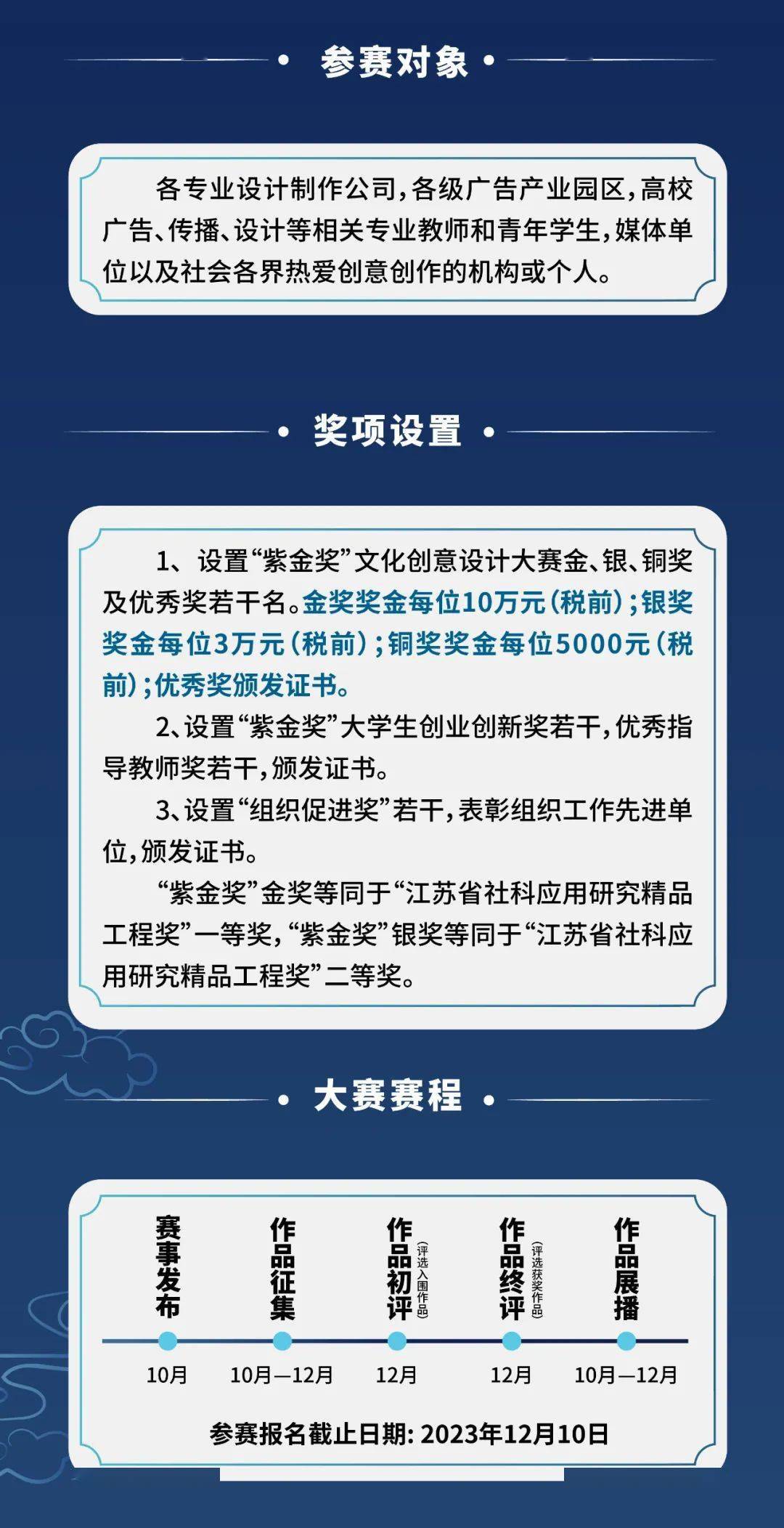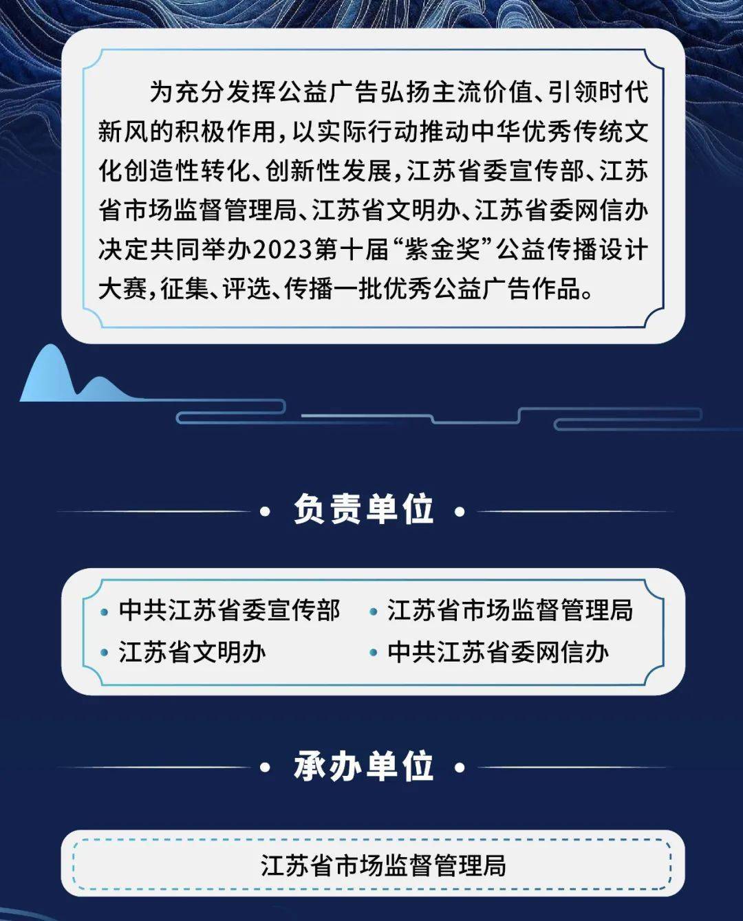 近日,由省委宣传部、省市场监管局、省文明办、省委网信办共同举办,省市场监管局具体承办的2023第十届“紫金奖”公益传播设计大赛正式公布赛事主题。