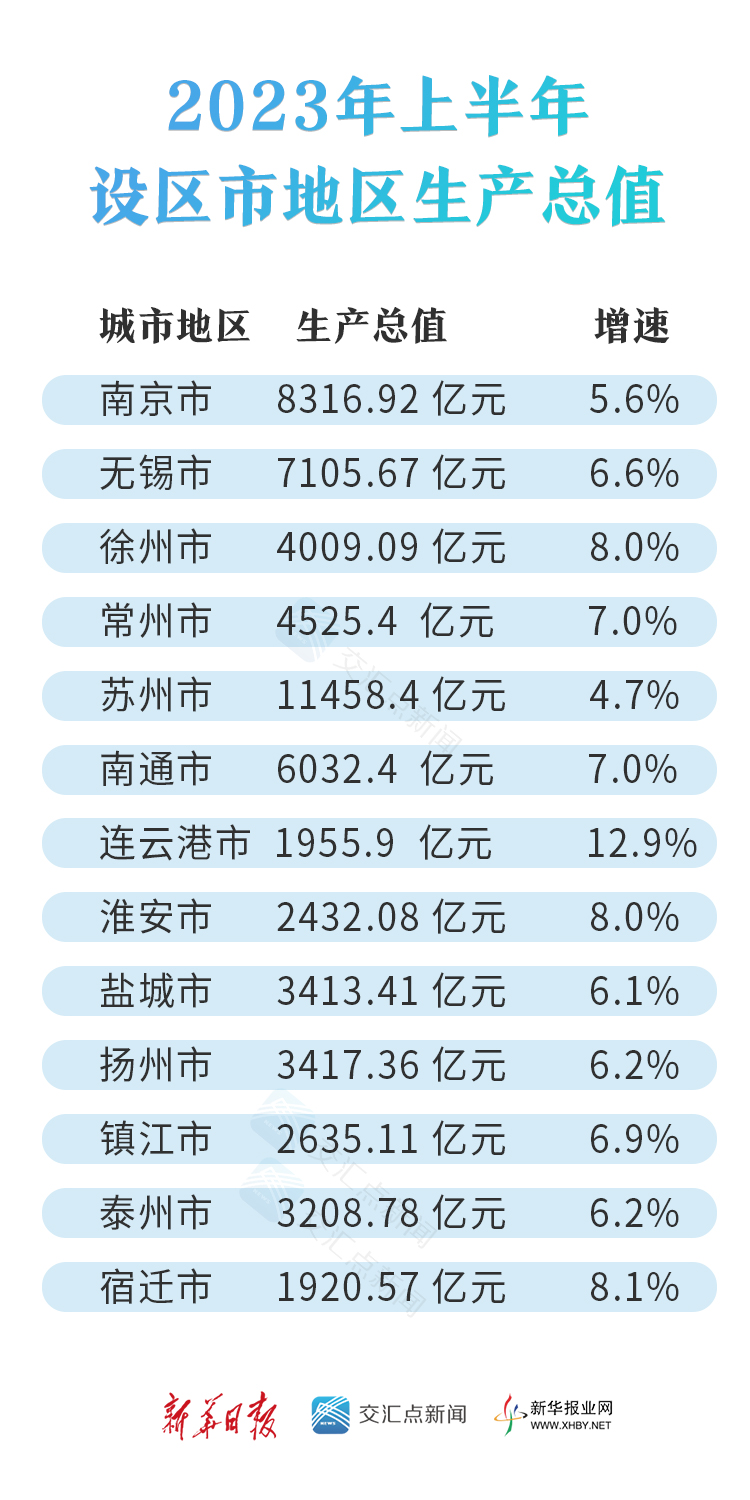 7月31日,随着徐州市2023年上半年数据的发布,江苏13个设区市的数据也全部出炉。具体来看,苏州市地区生产总值 11458.4亿元,南京市8316.92亿元,无锡市7105.67亿元,南通市6032.4亿元,常州市4525.4亿元,徐州市4009.09亿元,扬州市3417.36亿元,盐城市3413.41亿元,泰州市3208.78亿元,镇江市2635.11亿元,淮安市2432.08亿元,连云港市1955.9亿元,宿迁市1920.57亿元。