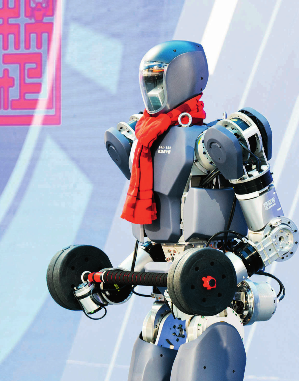 人形机器人在湖 北“全省加快建成中 部地区崛起重要战略 支点推进大会”上展 示负重技能(2025年2月5日摄) 肖艺九摄 / 本刊