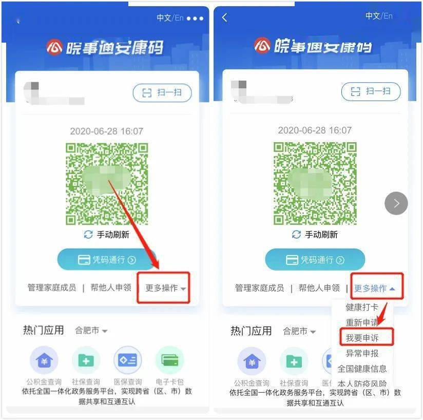 第一步:打开“皖事通”APP,进入“安康码”界面,找到码色下方“更多操作”,点击“我要申诉”。