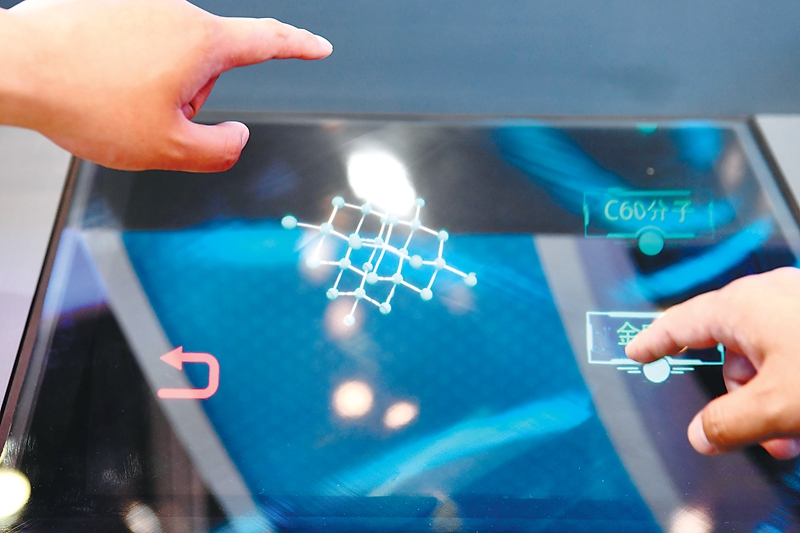 安徽省东超科技有限公司研发的空中成像提词器吸引参观者体验。