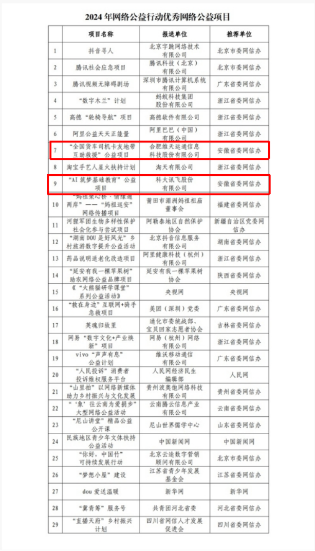 近日,在成都举行的中国网络文明大会,发布了2024年网络公益行动优秀网络公益项目29个典型案例,由安徽省委网信办报送的“全国货车司机卡友地带互助救援”和“AI筑梦基础教育”网络公益项目成功入选。